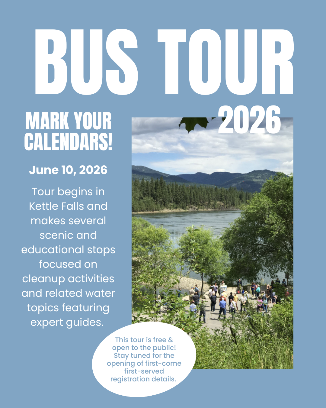 Our 2026 bus tour will take place on Wednesday, June 10th, from Kettle Falls to Northport and several stops in between. Throughout the day, we will hear from experts on various cleanup activities, fisheries programs, and other water-related topics.